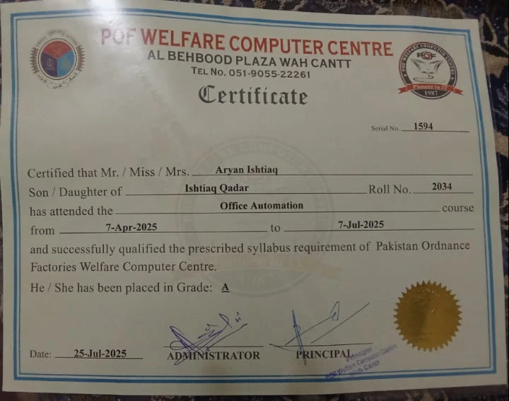 I earned my Office Automation certification from POF Welfare Computer Centre, Wah Cantt, with an A Grade, successfully completing the full syllabus of administrative and computer applications.