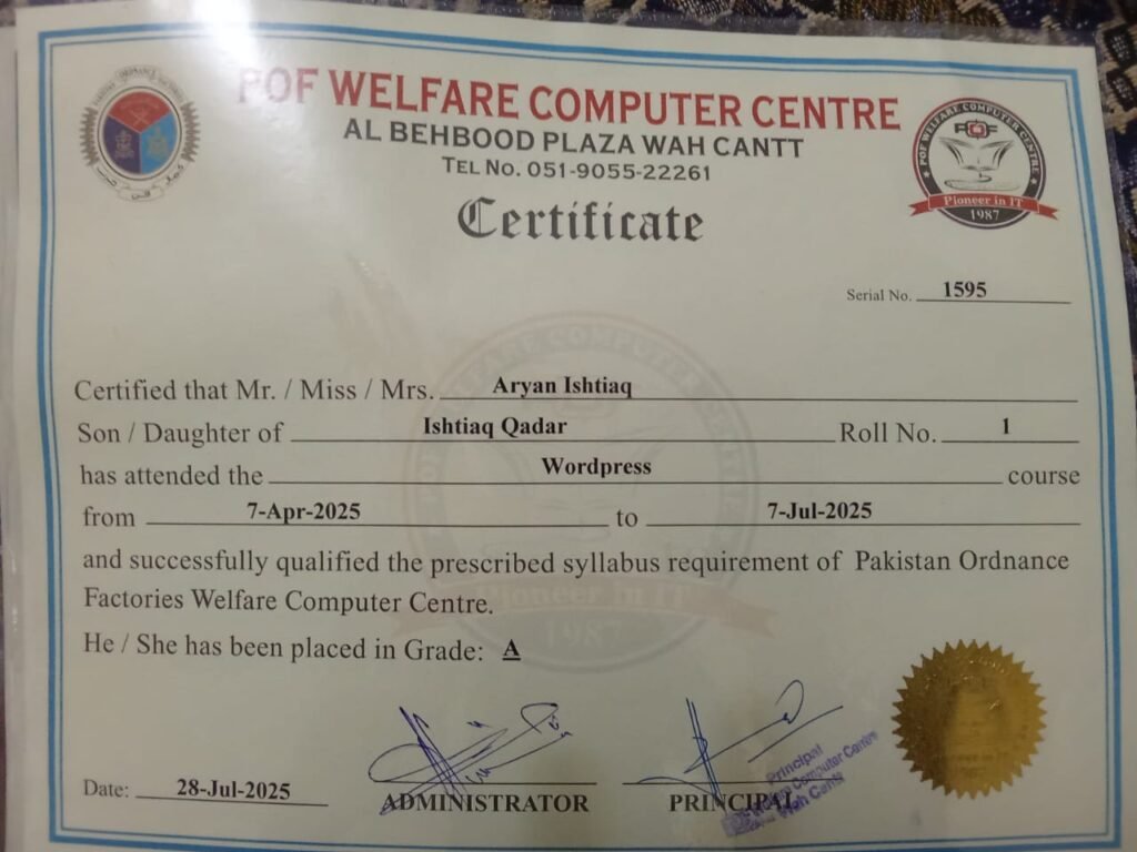 I successfully completed a professional WordPress course at POF Welfare Computer Centre with an A Grade. This certification highlights my expertise in building responsive, secure, and customized WordPress websites.